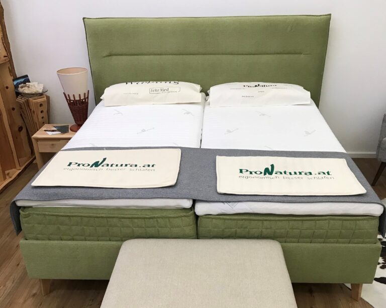 Mit Stoffbezug Farbe Grün/Größe Liegefläche 180×200 cm, durchgehenden Auflageleisten für das Innenleben (Schlafsysteme „Woodspring Inside-Set“ in Möbelstoff Farbe Grün/1x Trio weich und 1x Sensibel fest) mit Pyramidenfüßen/Eiche geölt