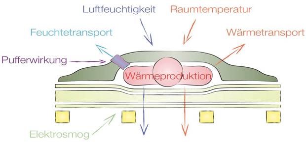 Innerhalb einer kleinen Toleranz kommt der menschliche Organismus mit Temperaturschwankungen sehr gut zurecht. Ist die Temperatur im Schlafzimmer und noch viel wichtiger, das Mikroklima im Bett nicht passend, schwitzt oder friert man. Zwei Drittel der Temperatur- bzw. Feuchtigkeitsregulierung findet nach oben und seitlich statt. Der richtigen Bettdecke aus Naturmaterialien, zur passenden Jahreszeit, kommt daher auch große Bedeutung zu.